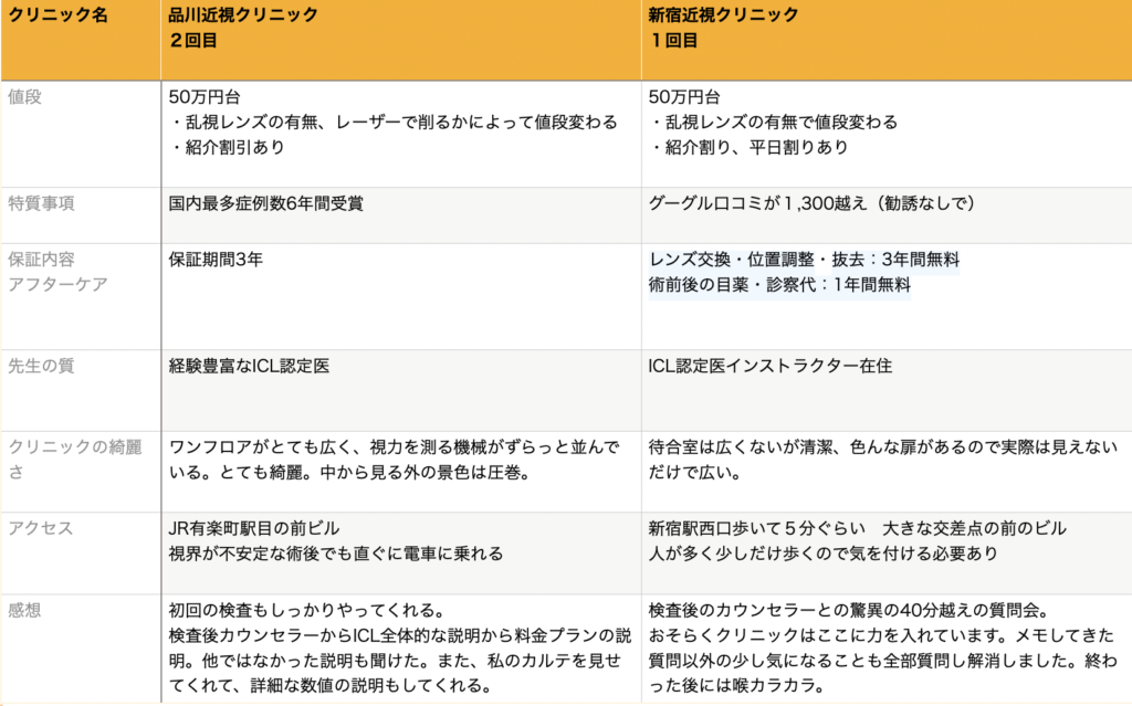 価格帯が50万~の新宿近視クリニックと品川近視クリニックを同じ週でカウンセリング予約して行きました。